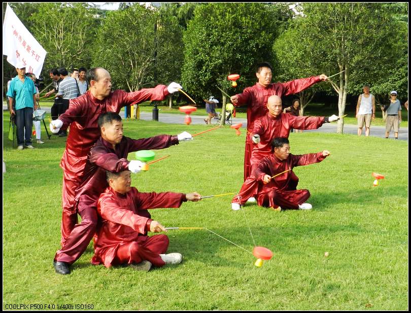 张爷爷的空竹现在已经抖的令人眼花缭乱、目不暇接。最为惊险骇人的是“蚂蚁上树”,长绳一端系于树梢,另一端手持;另有一人抖动一只空竹,忽然将飞转的空竹抛向长绳,持绳者用力拉动长绳,将空竹抖向高空,可飞上五六十公尺的空中。待空竹落下时,抖空竹者稳稳接住。真是堪称一绝了呢。