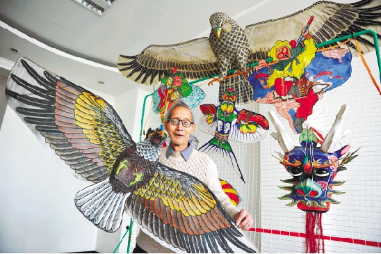 走进老人家,随处可见各式各样的风筝:“金鱼”、“蝴蝶”、“纸鸢”、“老鹰”,平面的、立体的、大的、小的……老人说自己平时不抽烟、不喝酒。别人爱打牌搓麻将上网玩游戏,那他爱做风筝练武术写写书法画点画。