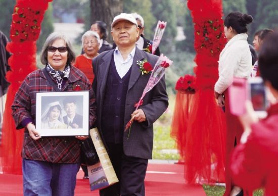 上午9点,圆明园公园内,一条百米红毯鲜艳夺目,婚礼进行曲缓缓响起,一百对白发夫妻手持玫瑰花款款走上红地毯,穿越象征人生五个不同阶段的玫瑰花门走向舞台,有的老人还带来了50年前的结婚照片,不少儿女一路跟随老人,记录下这一刻。